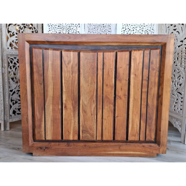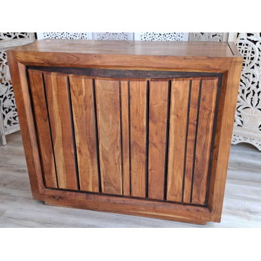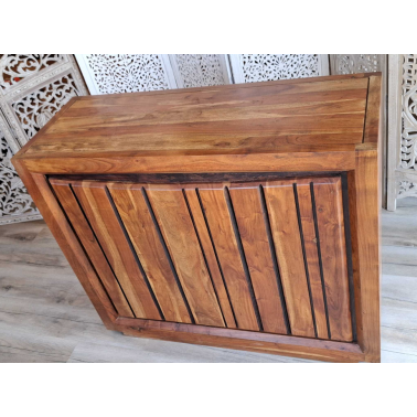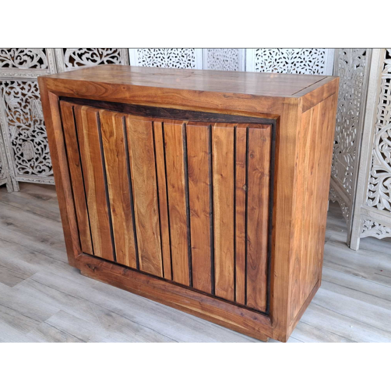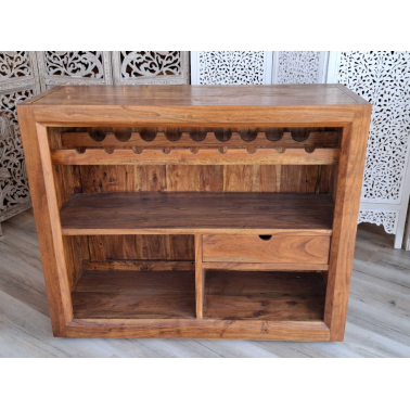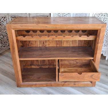 Wolnostojący barek, wykonany z drewna akacji przez indyjskich stolarzy, wybarwiony w ciepłym, miodowym kolorze z charkterystycznymi dla tej kolekcji nacięciami i polakierowany twardym, półmatowym lakierem zabezpieczającym powierzchnię. Do dyspozycji mamy trzy duże półki, szufladę oraz stojak na dziewięć butelek. Do produkcji naszych mebli, wykorzystywane jest tylko drewno wysokiego gatunku tak, aby zapewnić najwyższą jakość wyglądu oraz dać gwarancję na wieloletnie użytkowanie.