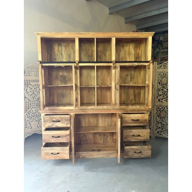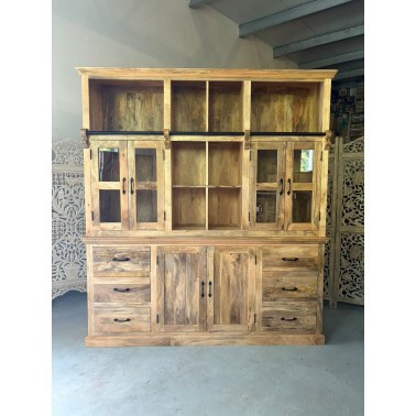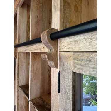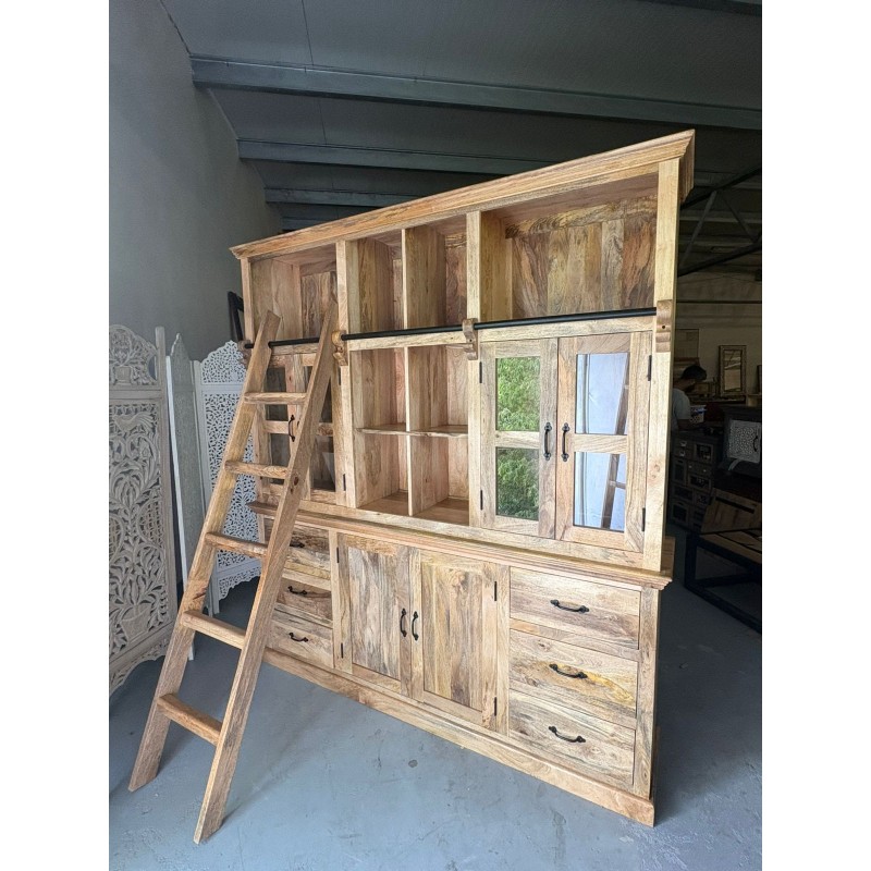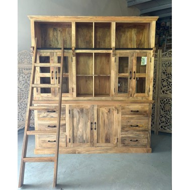 Biblioteka. Indyjski majstersztyk, ręcznie wykonana z egzotycznego drewna mangowca. Prosta bryła z frezowanymi elementami wykończeniowymi dzięki czemu mimo swoich gabarytów biblioteczka jest lekka w odbiorze. W celu ułatwienia dostępu do górnych półek do biblioteczki dołączona jest drabinka.