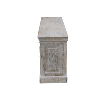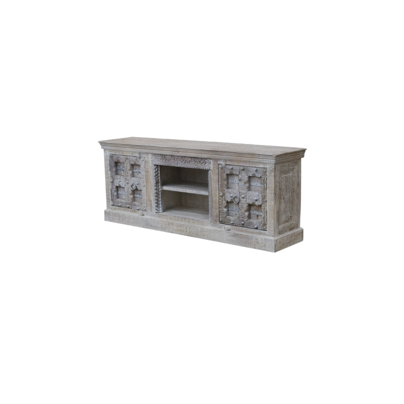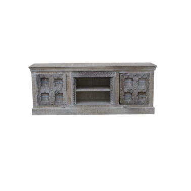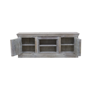 Wyjątkowa szafka RTV wykonana z litego drewna mango, łącząca funkcjonalność z dekoracyjnym, rzemieślniczym designem. Bogato rzeźbione fronty z ornamentalnymi wzorami nadają meblowi wyrazisty, orientalny charakter, a jasne, przecierane wykończenie podkreśla naturalną strukturę drewna i styl vintage.