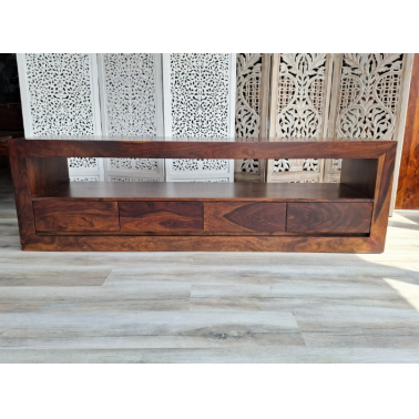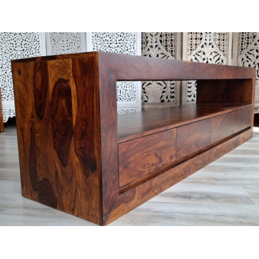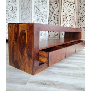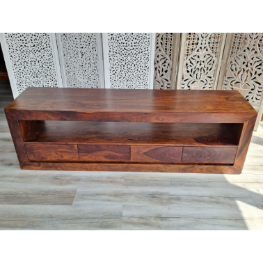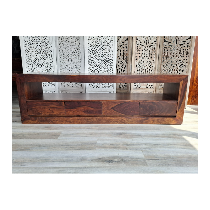 Nowoczesna, duża- 200cm. indyjska komoda RTV wykonana ręcznie z egzotycznego drewna. Mebel o klasycznej formie, wyprodukowany w całości z indyjskiego palisandru, będzie idealnym dopełnieniem zarówno klasycznych, jak i nowoczesnych wnętrz. Do dyspozycji mamy pięć pojemnych szuflad, przestrzeń na sprzęt RTV oraz powierzchnię blatu. Prosta forma perfekcyjnie koresponduje z obfitością bogato usłojonego palisandru indyjskiego, co zostało dodatkowo podkreślone jasnym, miodowym wybarwieniem oraz półmatowym lakierem.