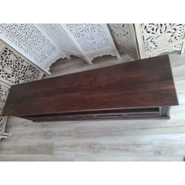 Charakterystyczne zdobienia na frontach komody to kwintesencja indyjskiego rzemiosła artystycznego. Ich misternie rzeźbione wzory wprowadzają do pomieszczenia subtelny, orientalny akcent, nadając meblowi unikalny charakter.