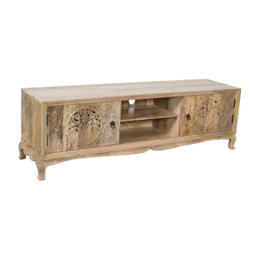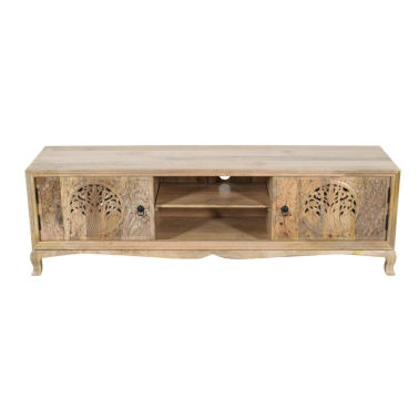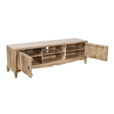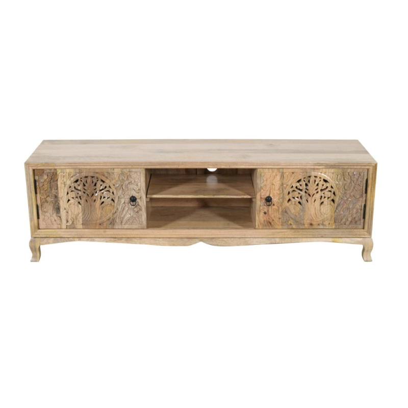 Komoda RTV w kolorze naturalnym to elegancka propozycja dla osób ceniących spójność, ciepło i autentyczny charakter wnętrza. Wykonana z drewna mango, zachwyca wyraźnym usłojeniem oraz przyjemnym, naturalnym odcieniem, który podkreśla jej szlachetny wygląd.