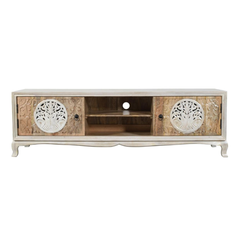 Fronty zdobi dekoracyjny motyw drzewa życia, starannie wyżłobiony w powierzchni drzwi. Ten wyjątkowy detal nadaje komodzie artystycznego wyrazu i przyciąga wzrok, wprowadzając do przestrzeni nutę symboliki oraz harmonii.