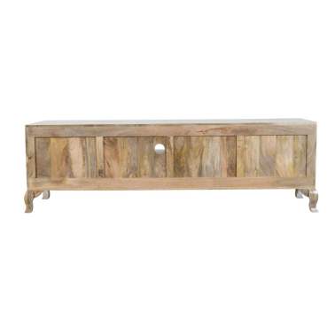 Komoda RTV w kolorze naturalnym to elegancka propozycja dla osób ceniących spójność, ciepło i autentyczny charakter wnętrza. Wykonana z drewna mango, zachwyca wyraźnym usłojeniem oraz przyjemnym, naturalnym odcieniem, który podkreśla jej szlachetny wygląd.