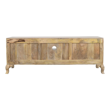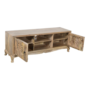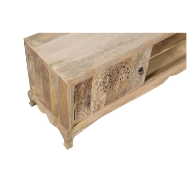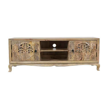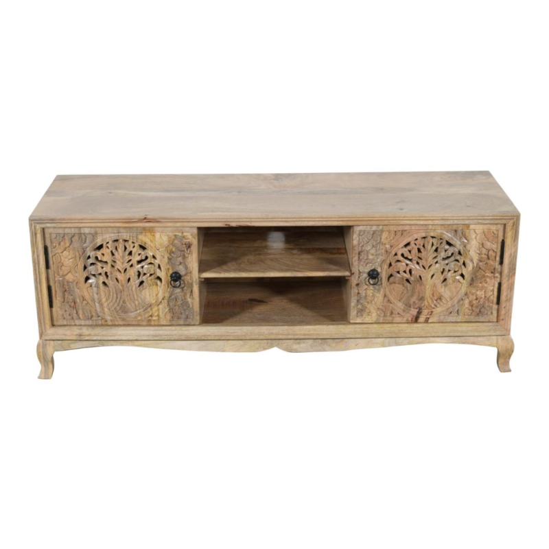 Komoda RTV wykonana z drewna mango to wyjątkowy element wyposażenia wnętrza, który przyciąga uwagę swoim niepowtarzalnym wzornictwem. Fronty zdobi efektowny motyw drzewa życia, misternie wyżłobiony w powierzchni, nadający całości artystycznego charakteru i subtelnej symboliki. To detal, który nadaje meblowi głębi oraz sprawia, że staje się on centralnym punktem aranżacji.