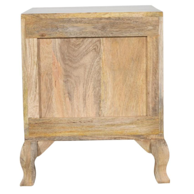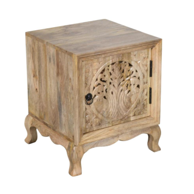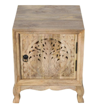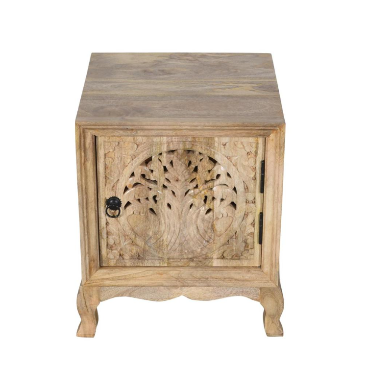 Szafka nocna z drewna mango to elegancki i stylowy element wyposażenia sypialni, który zachwyca naturalnym charakterem oraz dekoracyjnym wykończeniem. Front zdobi rzeźbiony motyw drzewa życia, który nadaje meblowi wyjątkowego, artystycznego wyrazu i wprowadza do wnętrza atmosferę harmonii oraz spokoju.