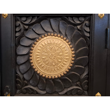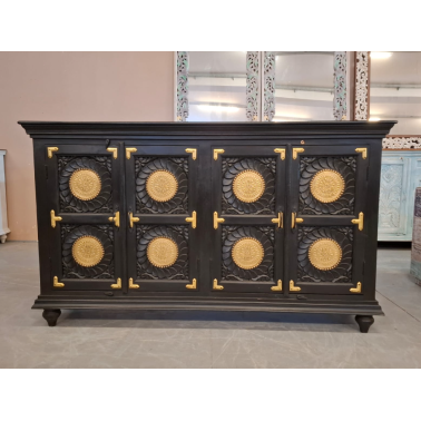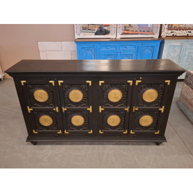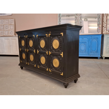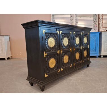 Najbardziej charakterystycznym elementem komody są fronty drzwiczek, które ozdobione są elementami w kolorze złotego. Ta złota dekoracja nadaje meblowi luksusowego wyglądu i tworzy efektowny kontrast z czarnym kolorem.