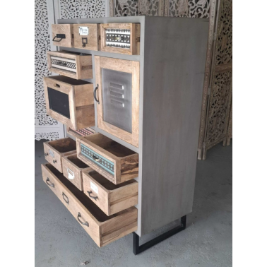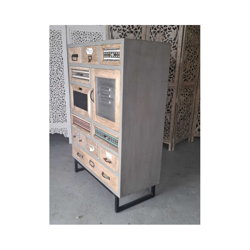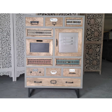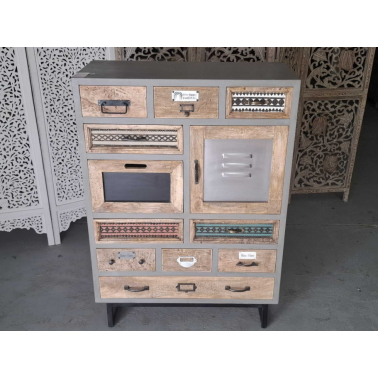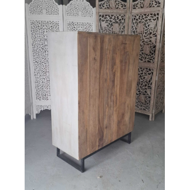 Industrialna komoda wykonana ręcznie z drewna mangowca indyjskiego, to wyjątkowe połączenie prostej formy ze zdobionym rzeźbieniami frontem z metalowymi uchwytami.