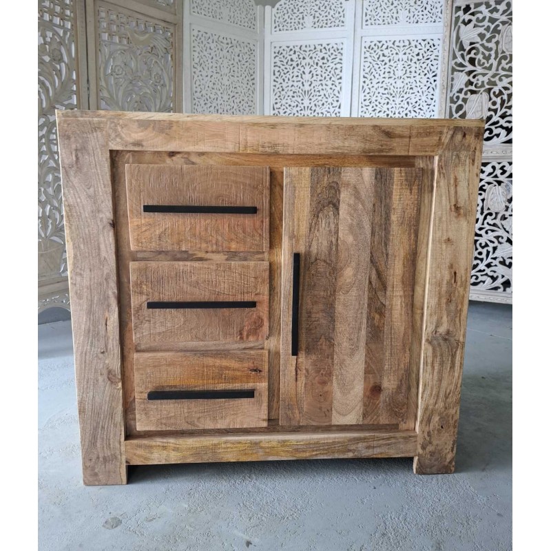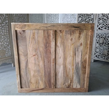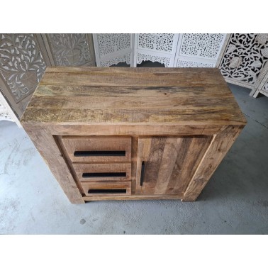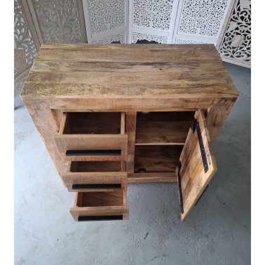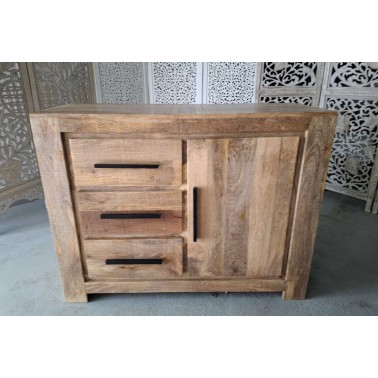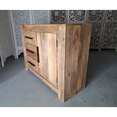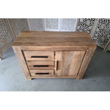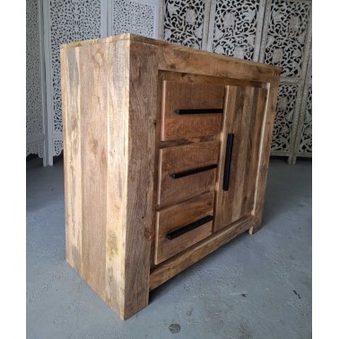 Niewielka, rustykalna komoda indyjska wykonana przez tamtejszych mistrzów stolarskiego rzemiosła, udane połączenie współczesnego wzornictwa z pięknym naturalnym materiałem. Prosta i funkcjonalna konstrukcja oraz naturalny kolor znakomicie podkreślają walory estetyczne tego gatunku drewna. Komoda posiada trzy szuflady w jej lewej części a po prawej stronie, szafkę zamykaną pełnymi, charakterystycznie dla tego stylu wykończonymi frontami dodatkowo uzbrojonymi w czarne, metalowe uchwyty, cechuje się prostotą i geometryczną bryłą. Jej forma uwydatnia urok egzotycznego drewna a w połączeniu z praktyczną konstrukcją tworzy elegancką i uniwersalną całość. Komoda sprawdzi się jako element nowoczesnego, gabinetu jak i salonu. Mango to jedno z najbardziej naturalnie oleistych gatunków drewna, przez co odpornych na wchłanianie wilgoci. Meble wykonane z tego drewna cechują się bogatą kolorystyką, co nadaje im ciekawego i bogatego wyglądu. Do produkcji naszych mebli, wykorzystywane jest tylko drewno wysokiego gatunku tak, aby zapewnić najwyższą jakość wyglądu oraz dać gwarancję wieloletniego użytkowania.