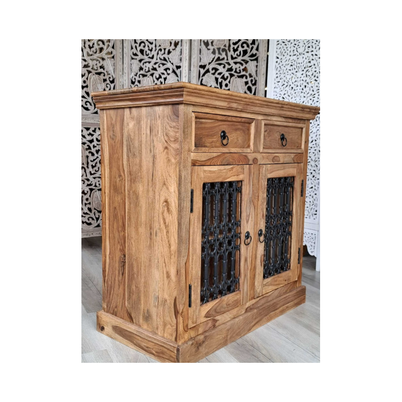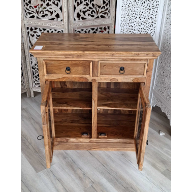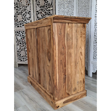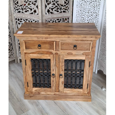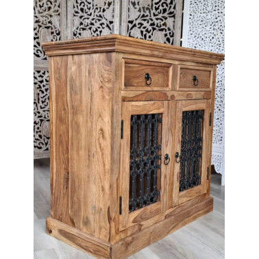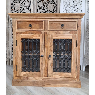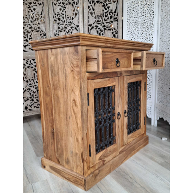 Niewielka komoda wykonana ręcznie przez indyjskich rzemieślników z drewna palisandru. Funkcjonalna i bardzo pakowna przechowa nasze najpotrzebniejsze rzeczy służąc nam przez długie lata. Dodatkowo zdobiona ażurową metaloplastyką i zabezpieczona szybą z pewnością perfekcyjnie udekoruje wnętrze domu. Wyposażona w dwie praktyczne szuflady oraz w dolnej części, również dwie pojemne szafki podzielone półkami. Całość obrobiona ozdobną, drewnianą listwą, wybarwiona w jasnym, orzechowym odcieniu i pokryta powłoką twardego, półmatowego lakieru. Palisander to jeden z najtwardszych gatunków drzew liściastych które cechują się ciekawym ułożeniem słoi, co nadaje im elegancki i bogaty wygląd. Nasze meble sprowadzane są z Indii bezpośrednio od producentów którzy poza ciekawymi wzorami kładą nacisk na wysoką jakość wykonania oraz odpowiednie selekcjonowanie surowca do produkcji swoich wyrobów.