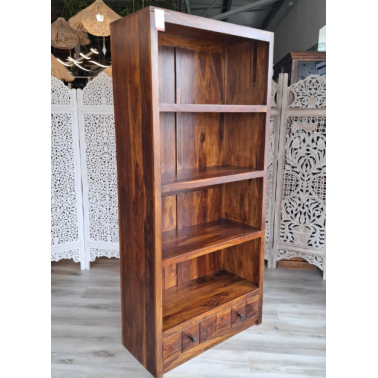 Komoda wykonana jest z drewna mango o wymiarach 90 cm szerokości, 40 cm głębokości i 106 cm wysokości. Komoda jest utrzymana w ciemnych odcieniach brązu, które nadają jej elegancji i stylowego wyglądu.