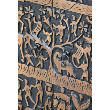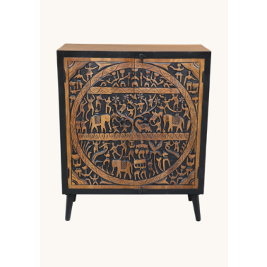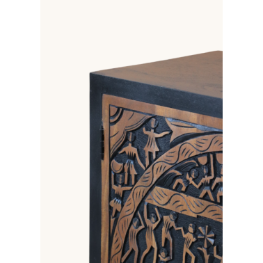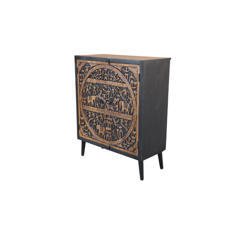 Elegancka komoda wykonana z litego drewna mango, wyróżniająca się efektownym, ręcznie rzeźbionym frontem. Centralnym elementem dekoracyjnym jest okrągły panel z bogatym reliefem przedstawiającym sceny inspirowane naturą i tradycyjną sztuką rzemieślniczą.