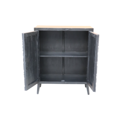 Za dwuskrzydłowymi drzwiami znajduje się praktyczna przestrzeń do przechowywania, idealna na różnego rodzaju przedmioty codziennego użytku – tekstylia, dokumenty czy akcesoria domowe. Komoda doskonale sprawdzi się w salonie, sypialni lub przedpokoju.