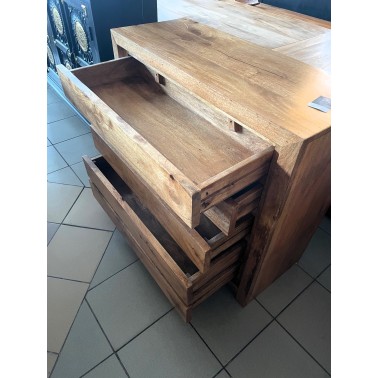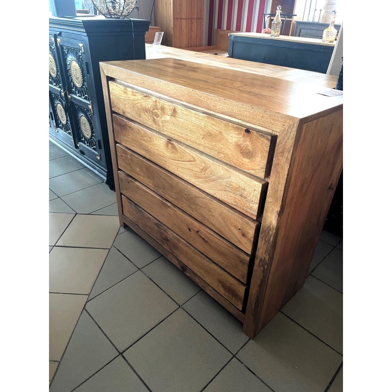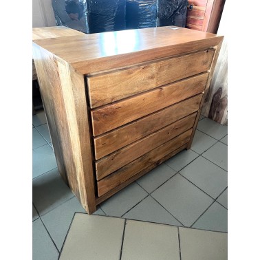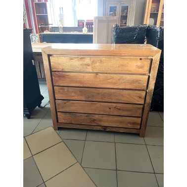 Komoda wykonana z drzewa mango. Pięć pojemnych szuflad, jasny odcień drewna został podkreślony przy użyciu bezbarwnego lakieru.