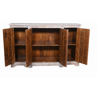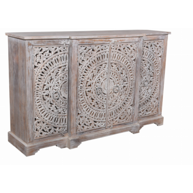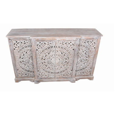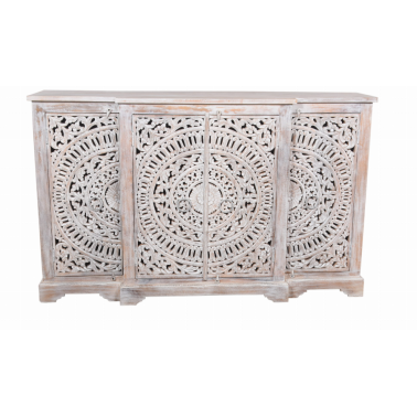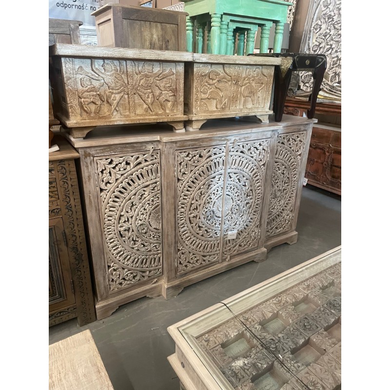 Komoda z drewna mango to wyjątkowy mebel, który zachwyca kunsztem wykonania i orientalnym wzornictwem. Jej front zdobią cztery rzeźbione drzwi z misternym, koncentrycznym motywem przypominającym mandalę. Subtelne przecieranie i bielone wykończenie nadają całości lekkości, a zarazem podkreślają artystyczny charakter mebla.