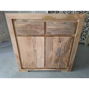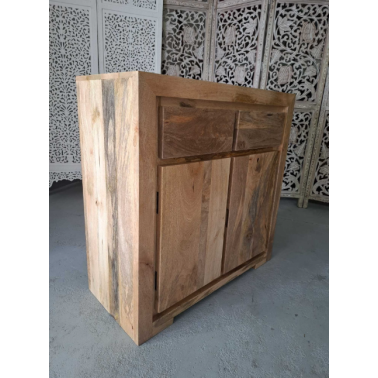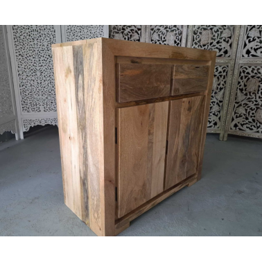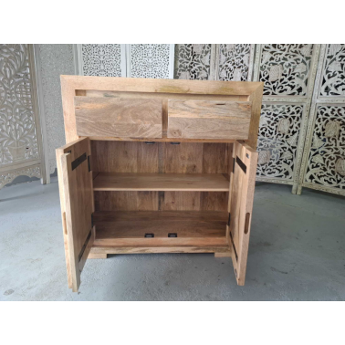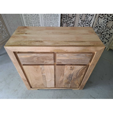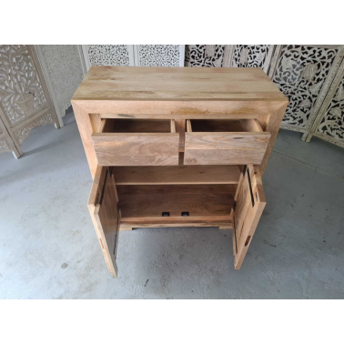 Niewielka, indyjska komoda z kolekcji ZEN, wykonana ręcznie przez tamtejszych rzemieślników, jest to udane połączenie minimalistycznego, współczesnego wzornictwa z pięknym naturalnym materiałem. Prosta i funkcjonalna konstrukcja oraz naturalny kolor znakomicie podkreślają walory estetyczne tego drewna. Komoda posiada dwie szuflady oraz dwie szafki zamknięte za pełnymi, gładkimi frontami, cechuje się prostotą i geometryczną bryłą. Jej forma uwydatnia urok egzotycznego drewna i w połączeniu z praktyczną konstrukcją tworzy elegancką i uniwersalną całość. Komoda sprawdzi się jako element klasycznego gabinetu jak i salonu.