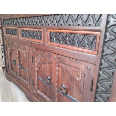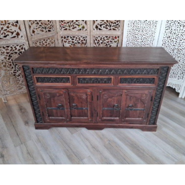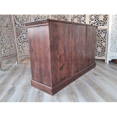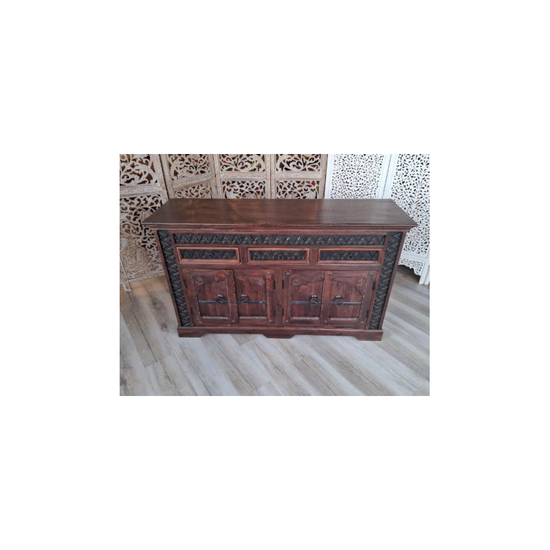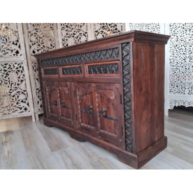 Komoda w ciemnym brązie z odcieniami wenge to kwintesencja stylu indyjskiego. Trzy szafki i trzy szuflady oferują funkcjonalną przestrzeń do przechowywania, idealną do organizacji różnorodnych przedmiotów.