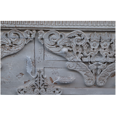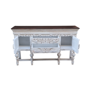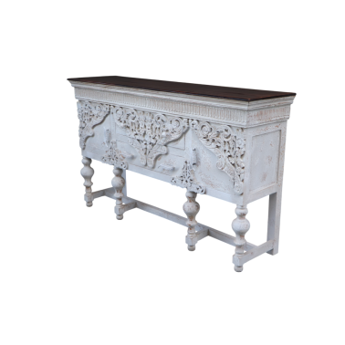 Konsola z drewna mango to wyjątkowy mebel o niezwykle dekoracyjnym charakterze, który zachwyca bogactwem ręcznie rzeźbionych detali. Jej front zdobią rozbudowane, ażurowe ornamenty roślinne, tworzące efektowną kompozycję pełną głębi i elegancji. Jasne, przecierane wykończenie w stylu vintage pięknie kontrastuje z ciemnym blatem, podkreślając naturalne usłojenie drewna i nadając całości szlachetnego, postarzanego wyglądu.