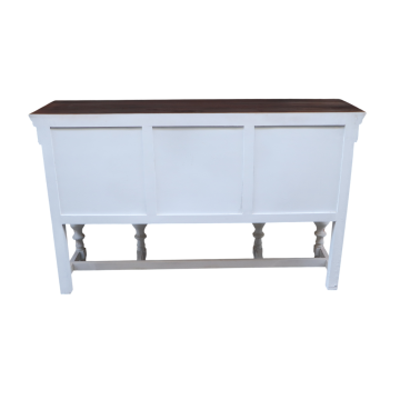 Mebel opiera się na mocnych, toczonych nogach połączonych poziomymi podporami, co dodaje konstrukcji stabilności i wprowadza tradycyjny, rzemieślniczy charakter. Subtelne zdobienia pod linią blatu dopełniają spójny, orientalny styl konsoli.
