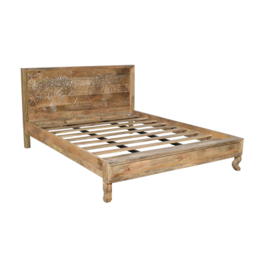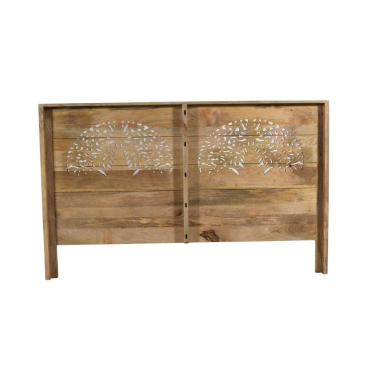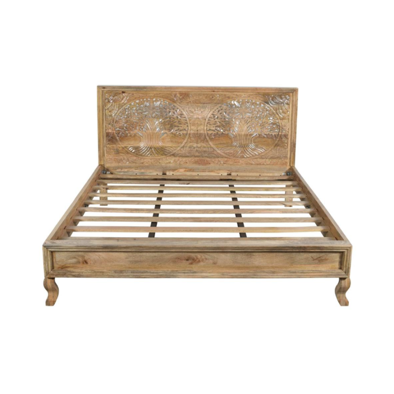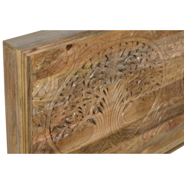 Łóżko z drewna mango to wyjątkowa propozycja, która łączy solidne wykonanie z dekoracyjnym charakterem. Najbardziej przyciągającym uwagę elementem jest zagłówek zdobiony misternymi rzeźbieniami przedstawiającymi motyw drzewa życia. Ten efektowny detal nadaje całości artystycznej głębi i wprowadza do wnętrza symbolikę harmonii oraz równowagi.