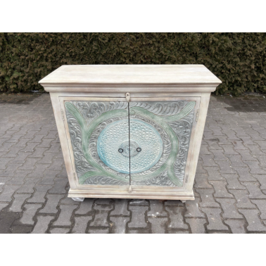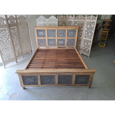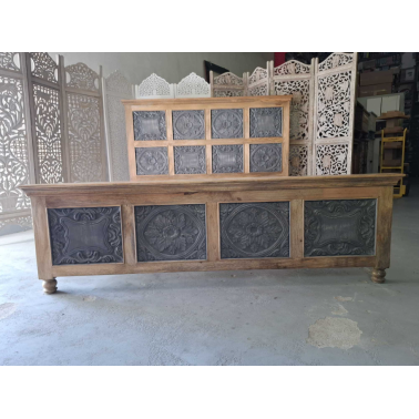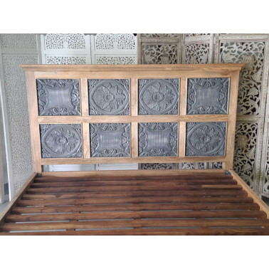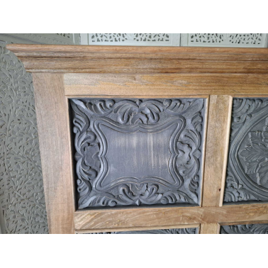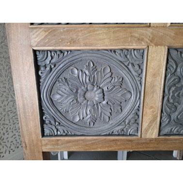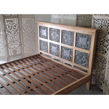 Jednym z charakterystycznych elementów tego łóżka jest rzeźbione wezgłowie. Rzeźbienia nadają łóżku indyjski charakter i dodają mu unikalności. Wezgłowie zostało starannie wykonane, aby stworzyć efektowny wzór i wizualne bogactwo.