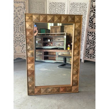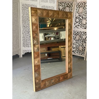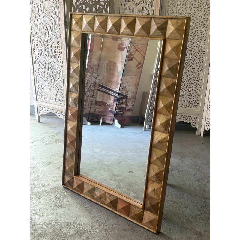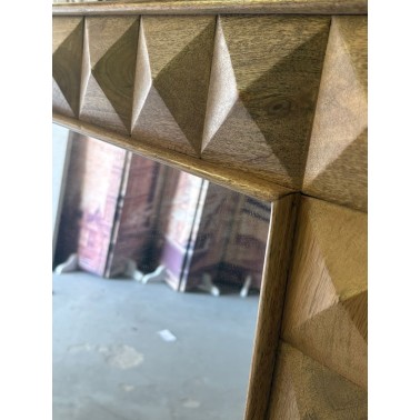 Rama wykonana jest z drewna mango w naturalnej kolorystyce, podkreślając jego ciepło i przyrodzoną urodę. Charakterystyczne zdobienia w postaci kwadracików dodają ramie unikalnego charakteru i elegancji, nadając jej wyjątkowego wyglądu.