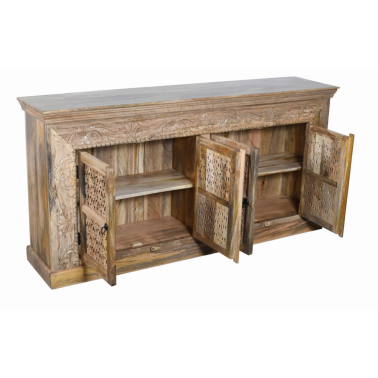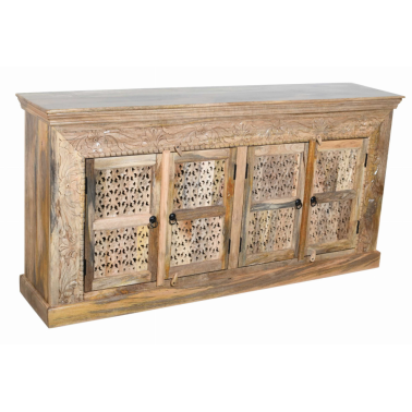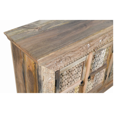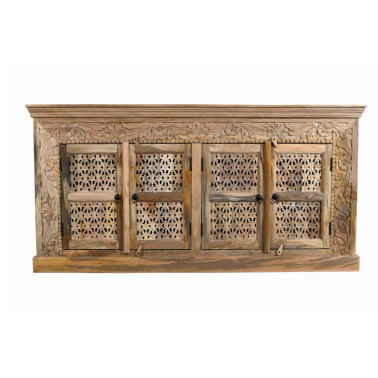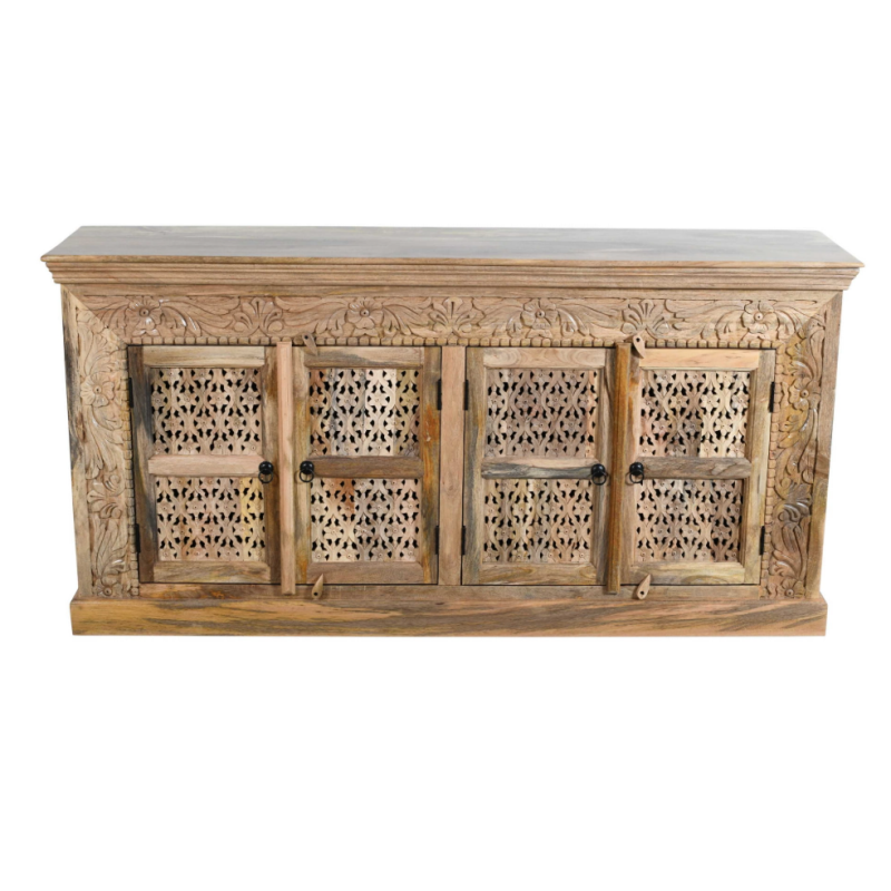 Zjawiskowa komoda indyjska wykonana z jasnego, naturalnego drewna mango, przyciąga wzrok misternie rzeźbionymi frontami i roślinnymi zdobieniami. Delikatne, ażurowe wykończenia drzwiczek w połączeniu z florystycznymi motywami w ramie tworzą spójną i elegancką całość, inspirowaną sztuką Orientu.