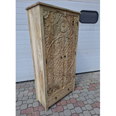 Piękna witryna wykonana z drewna mango, o wymiarach 97 cm szerokości, 42 cm głębokości i 200 cm wysokości, utrzymana jest w pastelowych odcieniach bieli i błękitu wprowadzając do pomieszczenia subtelność i delikatność wnętrza.