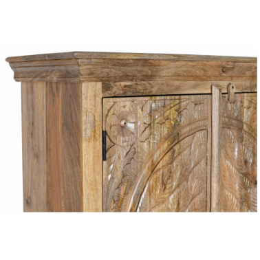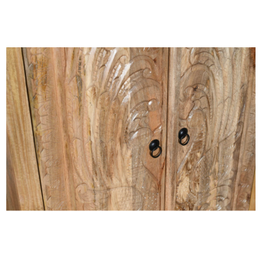 Ta niezwykła szafa przyciąga wzrok imponującą, ręcznie rzeźbioną dekoracją przedstawiającą dwa pawie w stylizowanym układzie lustrzanym. Skrzydła ptaków tworzą harmonijną kompozycję pełną symetrii i finezyjnych detali, uzupełnioną roślinnymi ornamentami i geometrycznym tłem w górnej części. Całość utrzymana jest w surowym, jasnym wybarwieniu, które podkreśla głębię rzeźbienia i nadaje meblowi autentyczny, artystyczny charakter.