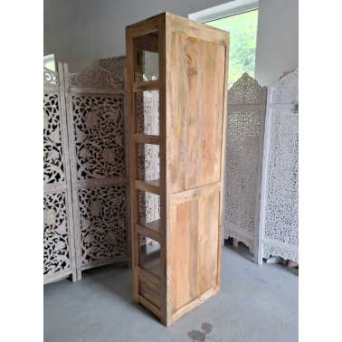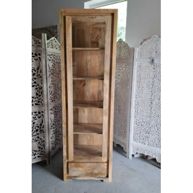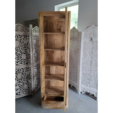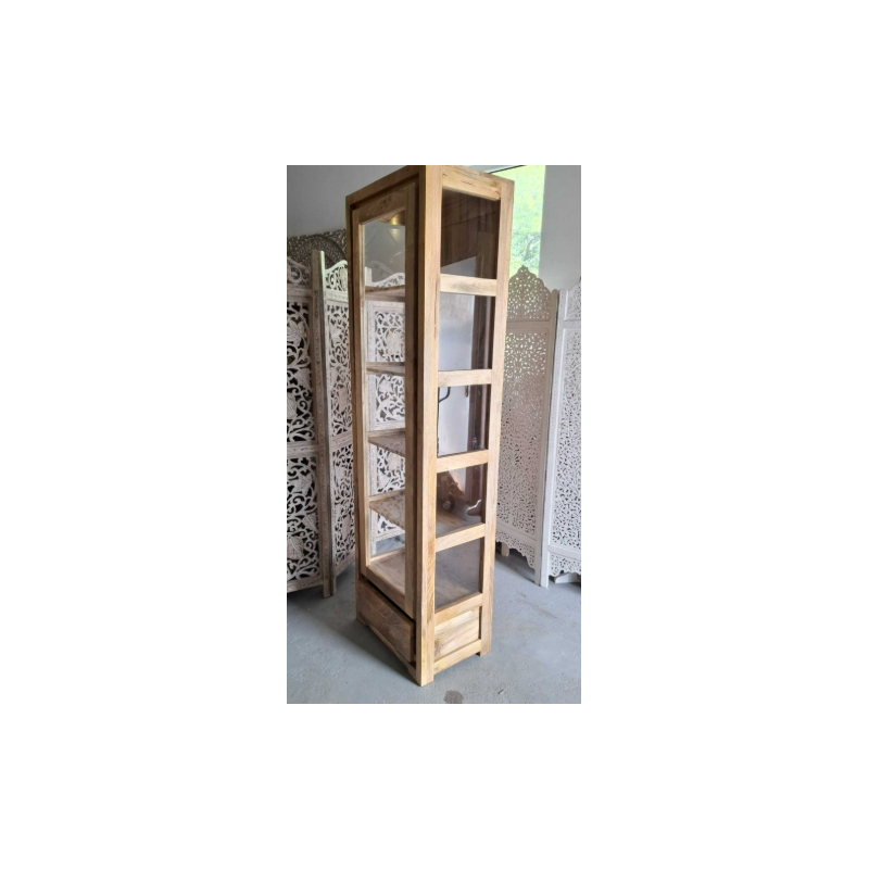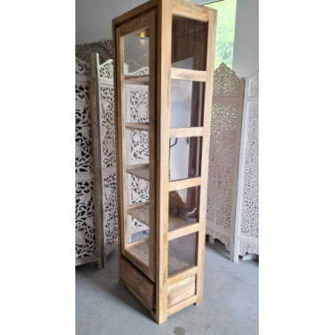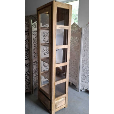 Nowoczesna witryna (szyba z trzech stron) wykonana ręcznie z drewna mangowca przez indyjskich mistrzów stolarskiego rzemiosła. Dzięki zastosowaniu bezbarwnego, półmatowego lakieru, udało się wyeksponować bardzo bogatą, naturalną kolorystykę tego odpornego na wilgoć drewna.